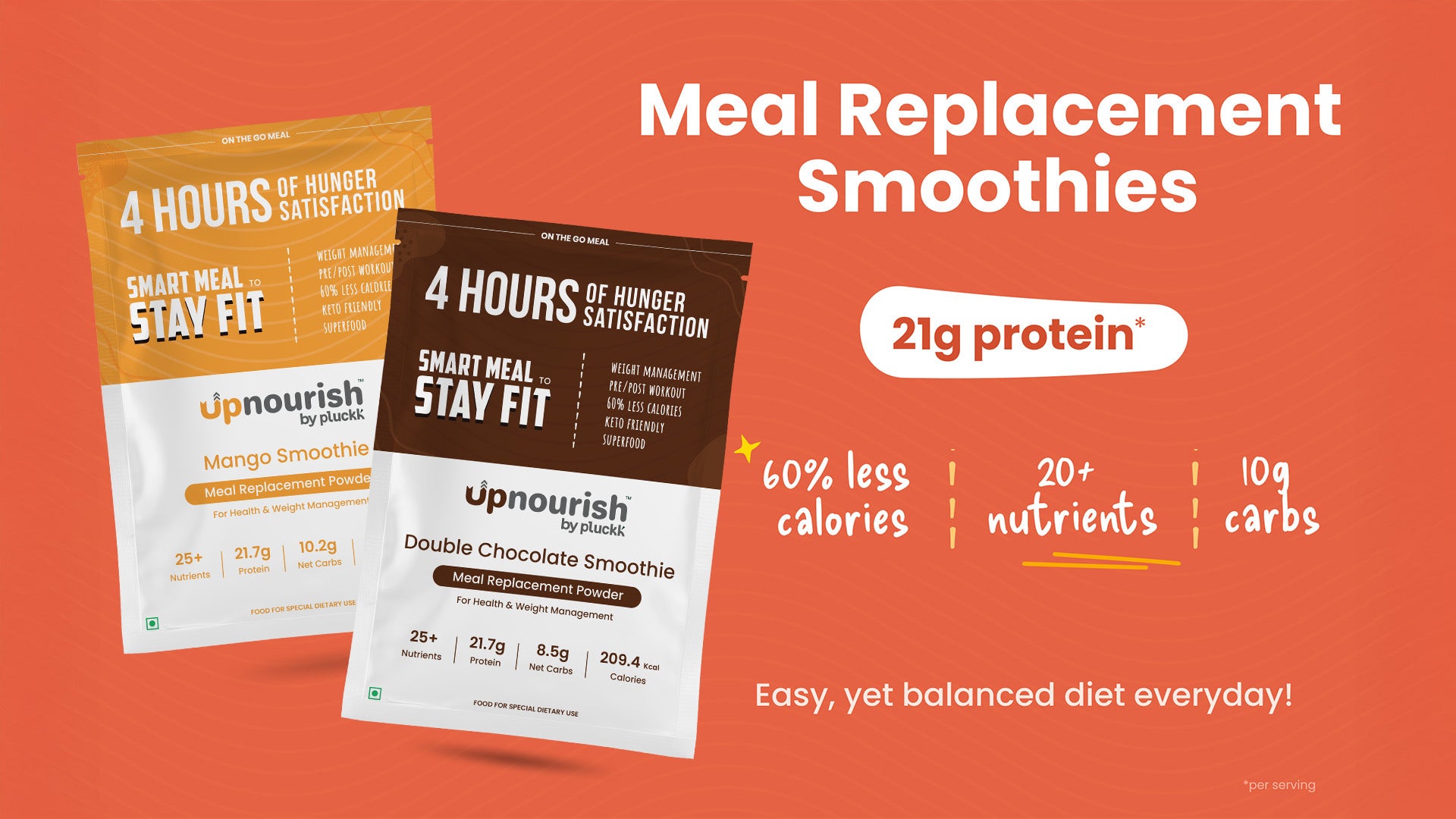 Try out Upnourish by pluckk meal replacement powder for smoothies for an easy, yet balanced diet everyday. Carry along the 23bmi vegan meal replacement smoothie on your weight gain and weight loss journey.
