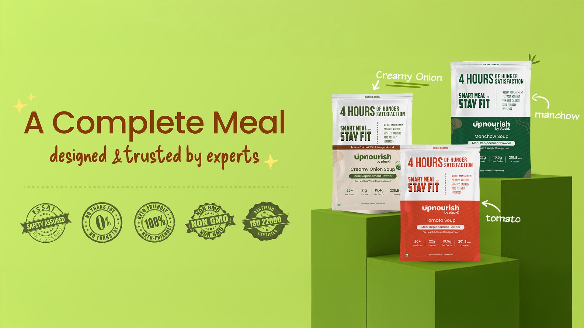 Upnourish by pluckk presents meal replacement soups for weight loss and weight gain. Ideal for busy schedules or as a replacement for everyday boring meals. Try out the plant-based meal replacement soups for weight loss and get on with your wellness goals today.